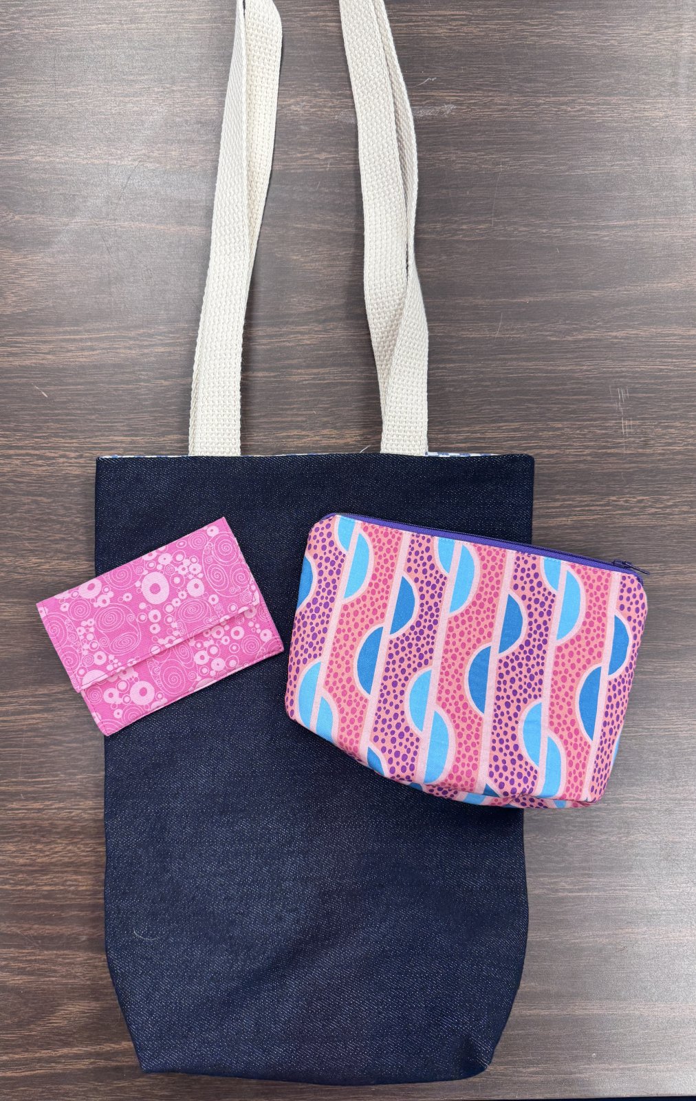 You’ll create: a tote bag, a zippered pouch and a simple wallet. Kits will vary. Image is for example only.